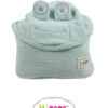 Η συγκεκριμένη πετσέτα, που μοιάζει με μπουρνούζι, έχει 2 πετσετέ κορδόνια που μπορούν να δέσουν γύρω από το λαιμό της μαμάς, ελευθερώνοντας τα χέρια της ώστε να κρατάει και να πλένει το μωράκι της χωρίς να βρέχεται. Μετά αγκαλιάζει το μωράκι, τυλίγοντας το με την πετσέτα επάνω της, λύνει τα κορδόνια και το μωρό είναι τυλιγμένο σε μια απορροφητική, υπέροχη πετσέτα.