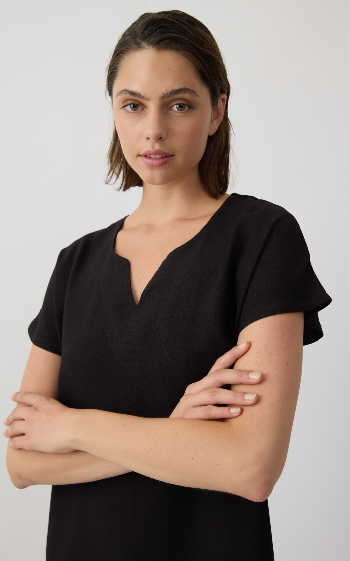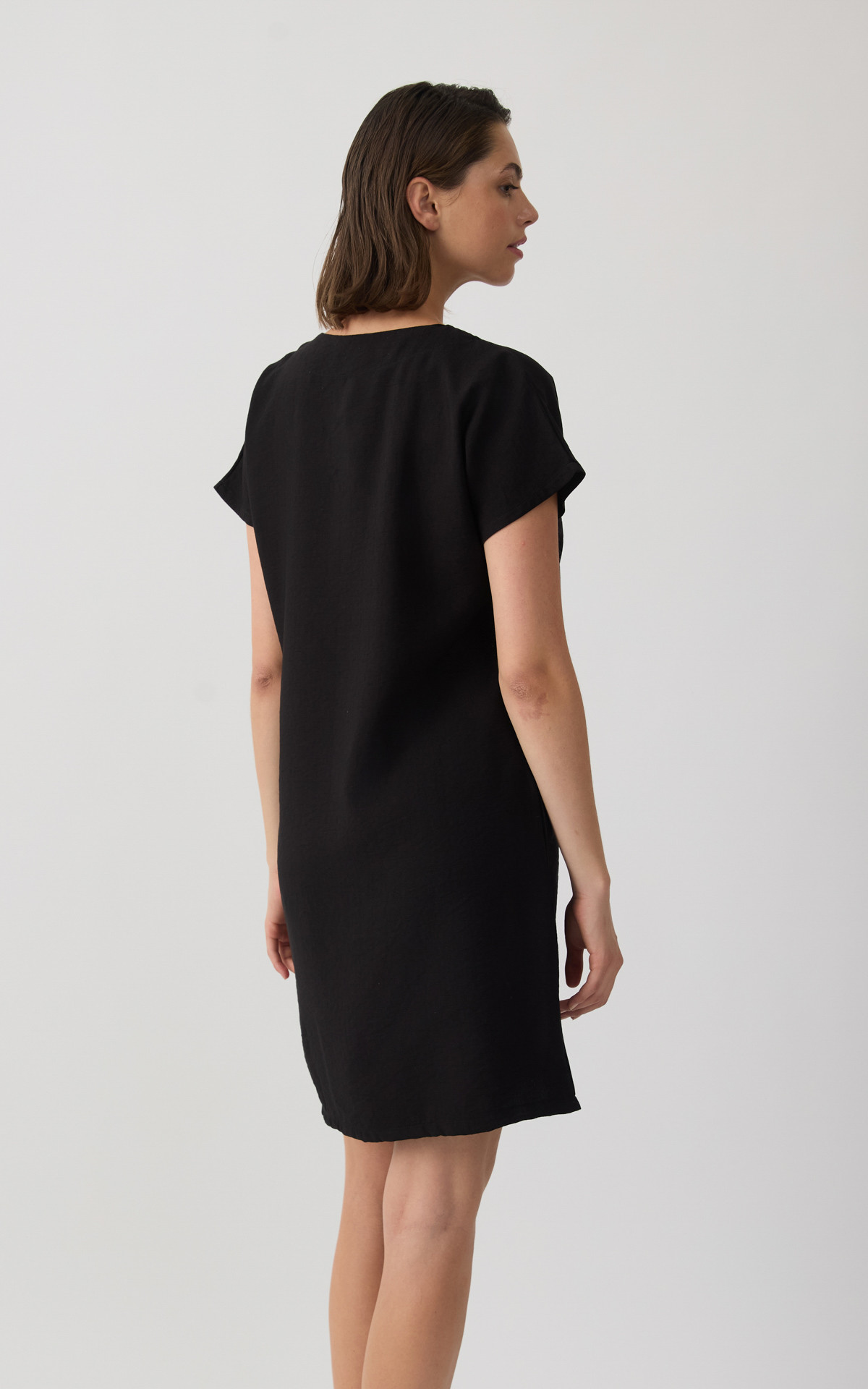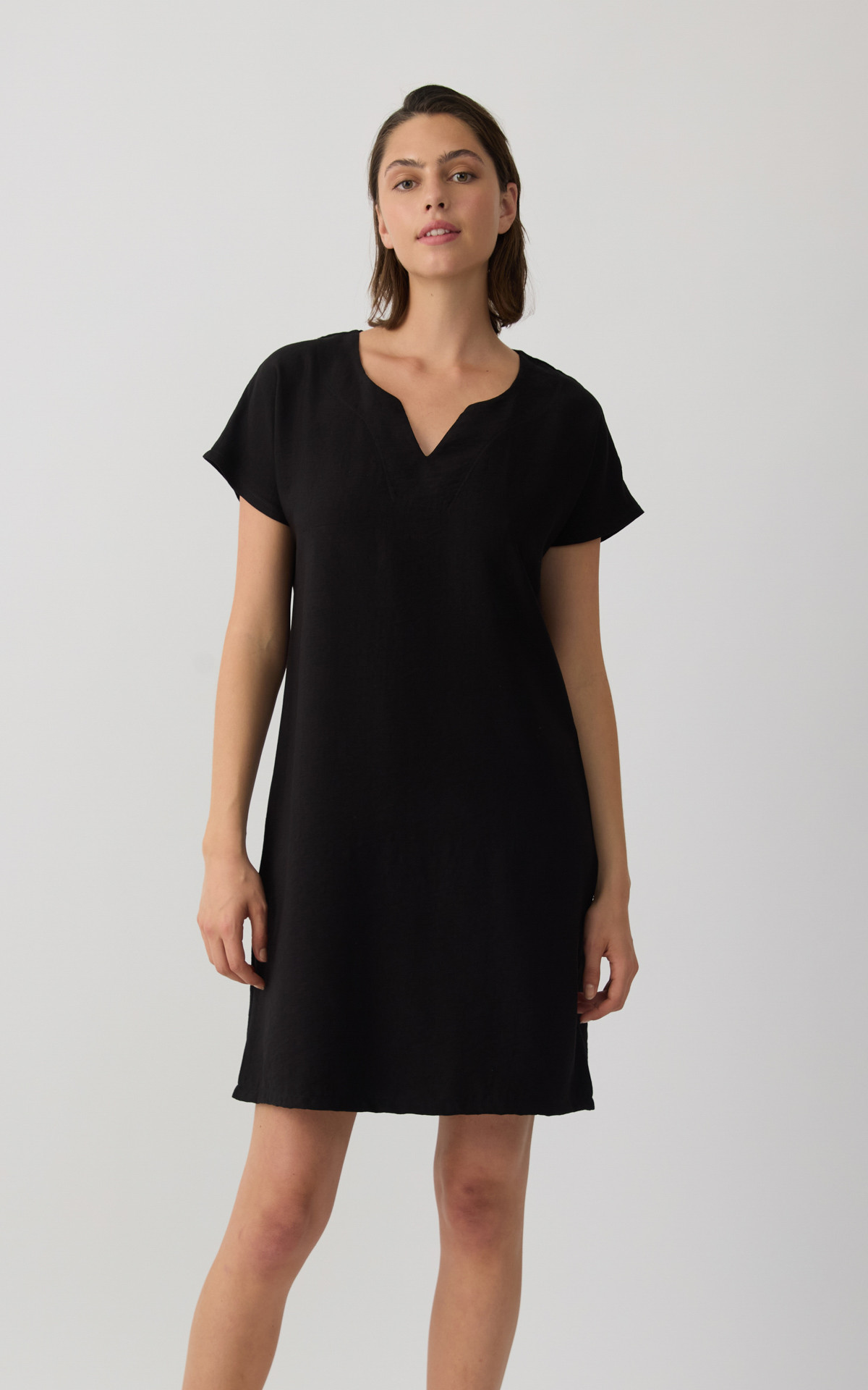 Φόρεμα κοντό, με V ντεκολτέ και κοντό μανίκι.